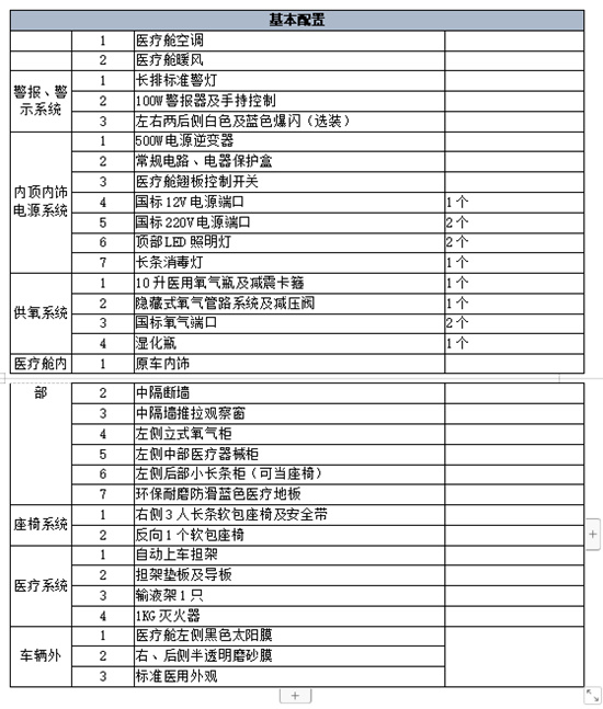 医疗舱左侧4宫格式 满柜,内置固定氧气瓶,舒适床垫,氧气终端以及 器械,创造出一致、直观的全功能组件,车门设在右侧,提供进入车内的另一个通道,隔断作折弯处理,保障驾驶员座椅调节舒适性,隔断后部装反向软包座椅,内部可作储物空间。